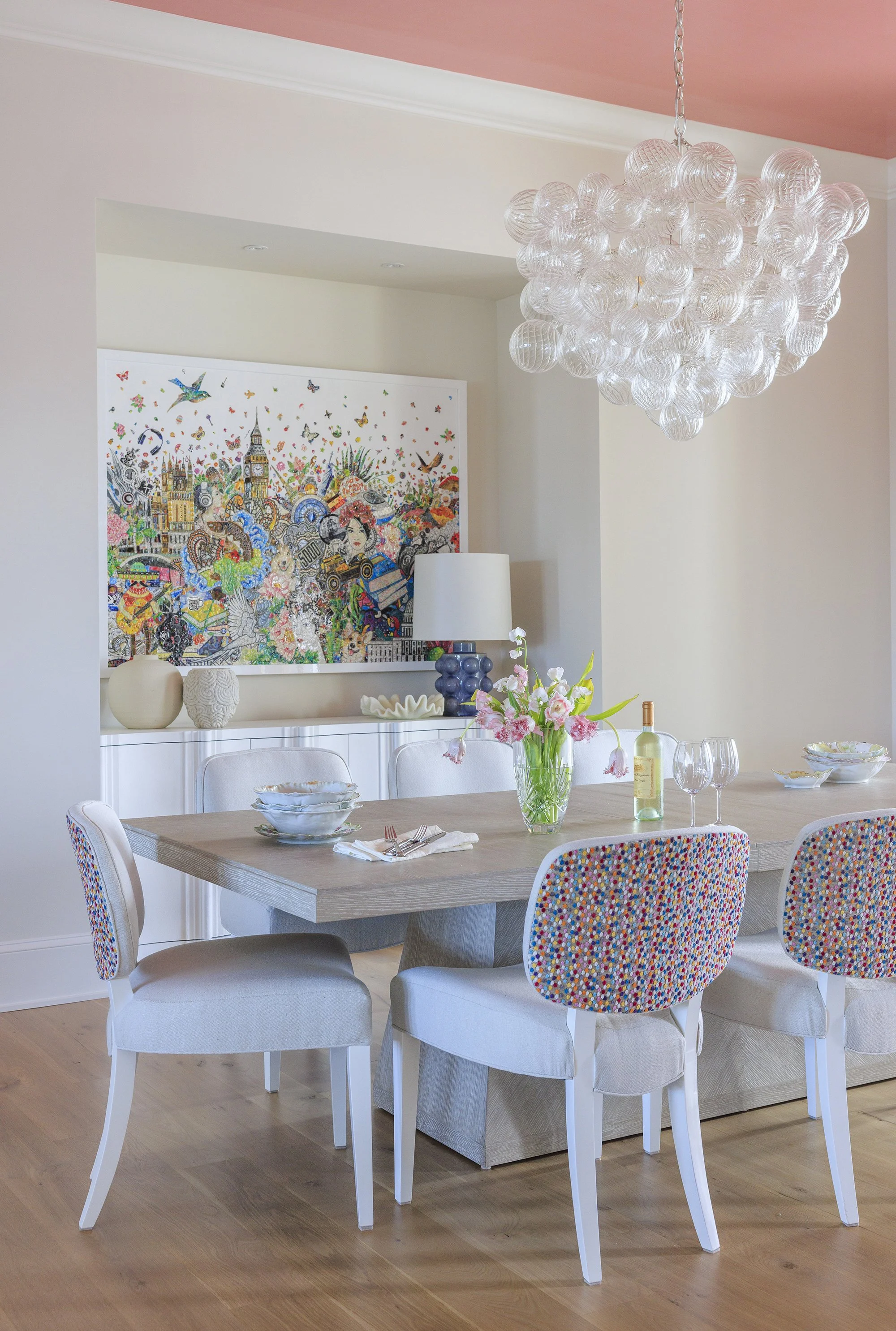 This home’s inspiration came from this custom art piece by Ye Hong Xing. It was commissioned to show all of the places our clients had lived and is amazingly made from thousands of puffy stickers! We loved the colors and whimsy this art piece and brought that inspiration into the design of the entire home.